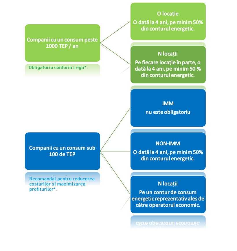 Conform Legii nr. 121/2011 privind eficiența energetică, auditul energetic este obligatoriu o dată la 4 ani pentru toți utilizatorii de energie care înregistrează un consum anual de minimum 1.000 tep/an (tone echivalent petrol).